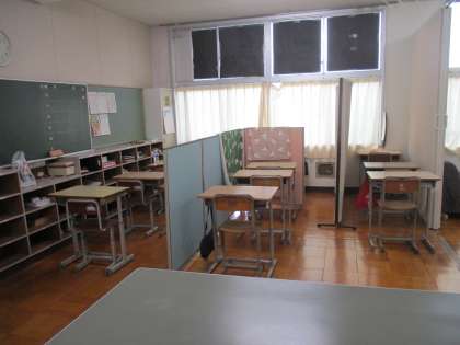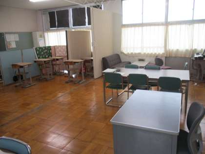 写真のように一つの部屋に2つの機能をもたせ、間をアコーディオンカーテンで仕切れるようになっています。子どもたちの可能性を引き出すための、大切な学びの場です。