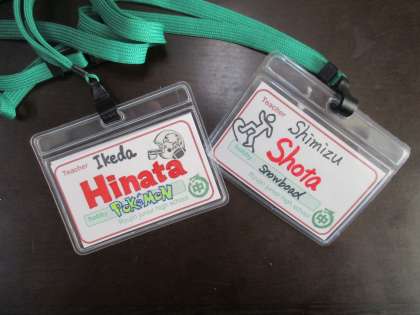 学年末テストを終えてほっとしている時間に、生徒は英語の名札を作りました。呼んでほしい部分を赤字で強調するなど、工夫していました。写真は先生の名札です。先生も4日間英語の名札をつけて、授業に挑戦です。
