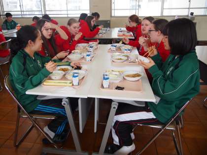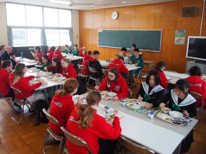 2/20 ダービーシャー交流(10) 公開日 2024/02/20 更新日 2024/02/20 学校行事 10月に2年生の代表生徒がダービーシャーの子たちとオンライン交流をしました。その時の生徒が今回来日しています。 給食の時間、オンライン交流を行った代表生徒と留学生で会食会を行いました。みんな、積極的に英語を使っていて、日本とは思えない空気でした。
