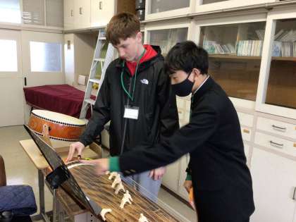 2/21 ダービーシャー交流(12) 公開日 2024/02/21 更新日 2024/02/21 学校行事 日本の音楽に触れています。それを生徒が教えています。交換留学生の子たちのおかげで、授業で学んだことを生かす場面ができました。