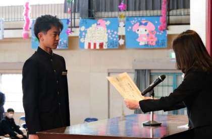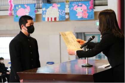 同窓会入会式に引き続き、表彰式を行いました。プレゼンターは若月会長です。同窓会規定に基づき、3年生に限らず表彰しました。