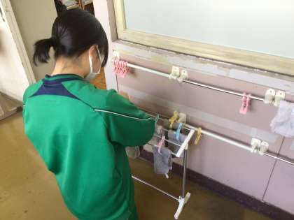 まず、分担して各クラスに新しい雑巾かけを配り、クラス名のシールを貼りました。