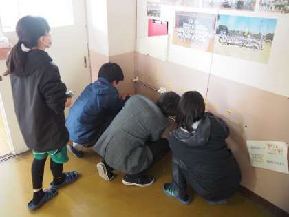 次に、ドライバーやスクレーパーなどの工具を使って、壁についている雑巾かけを取り除きました。時間の関係ですべての作業を完了することはできませんでしたが、3年生の教室を中心に雑巾かけをきれいにはがすことができました。