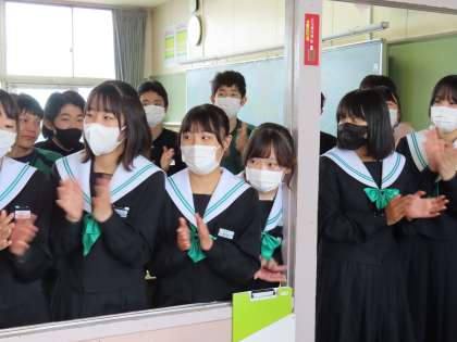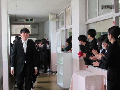 一つ:写真のように、1年生が体育館から退場した後に、2・3年生の廊下を歩く形をとり、そこで盛大な拍手をもらいました。