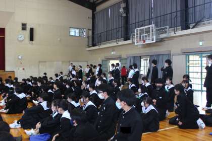 4月19日(金)自転車安全教室を、1年生は実施しました。小学校でも経験しているような内容ですから「知っているよ。」「聞いたよ。」と思ってしまいがちですが、命・安全に関わる指導です。こうした一見当たり前と思える内容から、たった一つでも、「今まで聞いたことがなかった」「改めて、意識していこうと思った。」といった心の動きや新たな考えが芽生える時間になるといいなと思います。