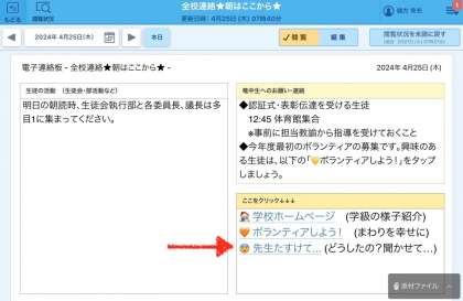 4/25 「先生たすけて」の紹介 公開日 2024/04/25 更新日 2024/04/25 生徒の活動 豊田市では、生徒が先生に悩みを気軽に相談できるように、学習用タブレットに「先生たすけて」の機能を設けています。 竜神中では、さらに生徒の目につきやすいように、朝の会で毎朝見る「SKYMENU 全校連絡板」にボタンをつけています。