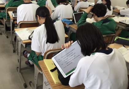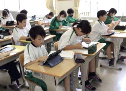1年生の英語では、一斉ではなく一人一人が自分のペースで音声練習していました。タブレットの機能を存分に生かしています。