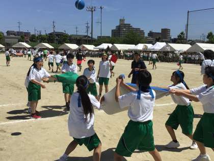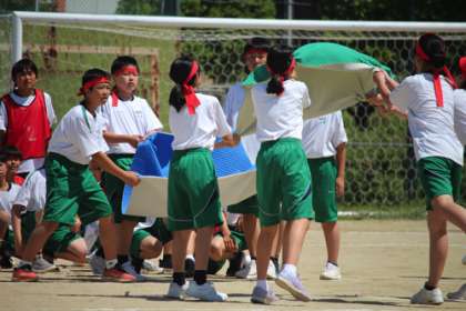 息を合わせて布を引っ張り、ボールを飛ばすのが難しい競技でした。一つのボールを大切に運びました。