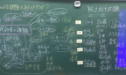 【目標】現代社会に存在する課題を調べて班で共有し、自分事として解決するべき課題を考える。