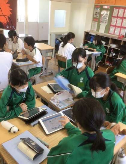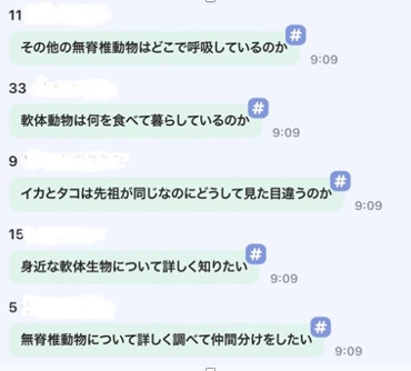 今年度はワークシートに振り返りをした後に、調べたいことや疑問に思ったことを「気づきメモ」に入力してみんなで共有して、その中から次の学習課題を出すことで、問いを立てるようにしている。写真は、無脊椎動物の学習後の気づきメモです。この無脊椎動物をなかま分けしたい、という意見から、動物のなかま分けにつなげた。