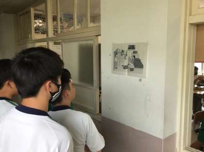 班の中で絵を見に行く人と絵を描く人に分かれ、絵を見た人にものの場所や数を英語で質問し、その答えを元にイラストを完成させるというグループワーク。