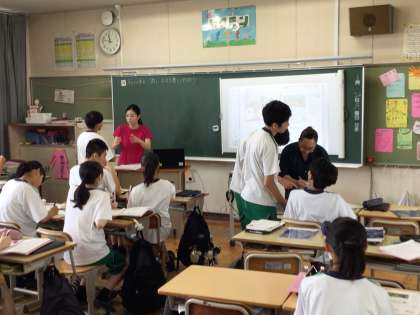 3年生、英語の授業で、先生と先生でコミュニケーションをとっています。新しい文法を習得するための授業です。