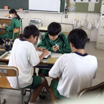 写真上:一人で学ぶ子、仲間と学ぶ子、先生の支援