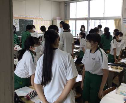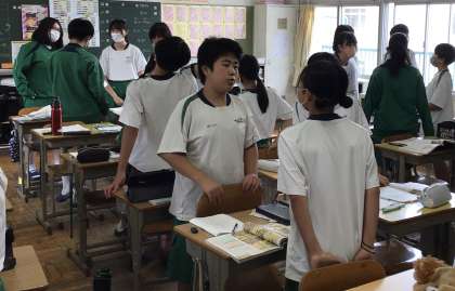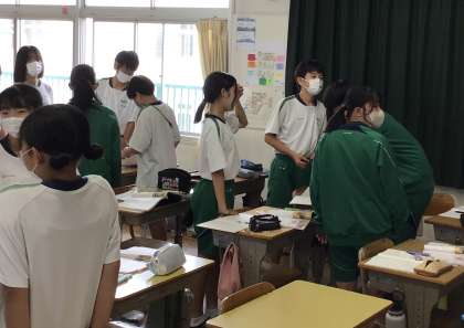 江戸幕府の授業です。途中、先生が少し難しい問いかけをしました。数名は考えが浮かんだようです。その数名を指名することなく、全員その場に起立。四人組をつくって対話を開始しました。