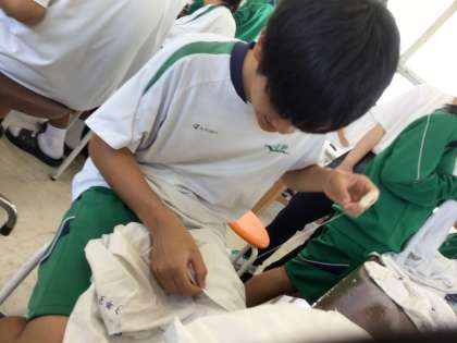 中央の写真は、保健給食委員会が、給食配膳用エプロンの修繕を行っているところです。ボタンを付け直したり、ほつれや破れを繕ったりする姿が見られました。「家庭科でやったことが活かせて嬉しいです」という声が聞かれました。
