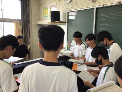 7/8 学年合唱『青葉の歌』(2年音楽) 公開日 2024/07/08 更新日 2024/07/08 生徒の活動 2年の学年合唱曲は『青葉の歌』です。若々しく伸びて広がっていく感じが2年生にピッタリです。 さすが2年生。無駄な声、動き、休憩はほとんどありません。限られた時間にどんどん音を覚えていきます。途中、顔を寄せ合ってパートで確認のミーティングができるのも成長の証です。昨年度の合唱練習が生きています。