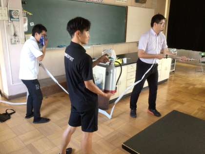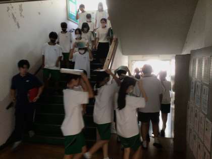 その後、火災を想定し、校外への避難も行いました。実際には、防火シャッターが降りている可能性もあるため、いつもとは違う避難経路を体験しました。生徒たちは、緊張した雰囲気の中で真剣に取り組み、今日一日の中で最も静かな時間となりました。