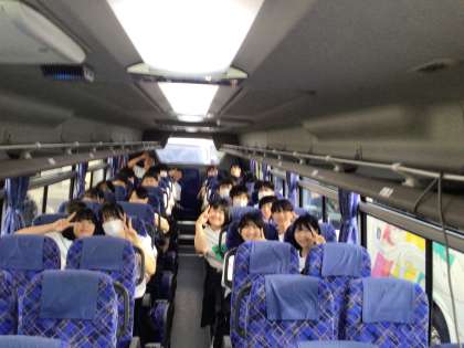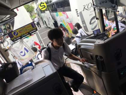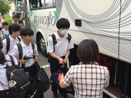 出発式を終えた生徒たちがバスに乗車していきました。バスガイドさんや運転手さんに元気に挨拶をしながら、荷物をバスに積み込んでもらいました。いよいよ出発です。