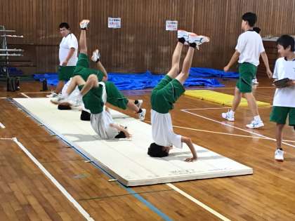 9/25 四人衆で成功したい(2年体育) 公開日 2024/09/25 更新日 2024/09/25 生徒の活動 三点倒立の場面を見ました。 三点倒立のコツは、手と頭の位置が三角形(正三角形)になることです。そして、頭の方に体重を乗せられたら、自然と足が上がります。 コツをつかんだ生徒が一人、二人。すると、僕たち四人衆だから!と4人で必死に練習。こうした学びの姿を見ると、感動します。