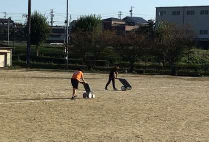 運動場は夜間ナイターで使われます。体育の授業用にラインをたびたび引かなくてはなりません。体育の先生にとっては早朝のたいへんな準備です。