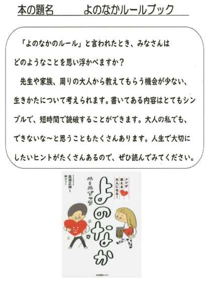 図書委員会の恒例企画「先生のおすすめ本」です。図書室に行くと、誰がすすめているか分かります。本を手にとって読書を楽しんでください。