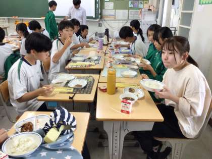 11/5 少しずつ日常に…給食の時間 公開日 2024/11/05 更新日 2024/11/05 生徒の活動 虹竜祭を終えて日常が戻りつつあります。おかげさまでインフルとコロナの拡大も今のところみられません。そのため、心配の少ないクラスから机をつける仲良し給食に戻しています。 ですが、定期テストも近いです。気を許し過ぎてはいけません。