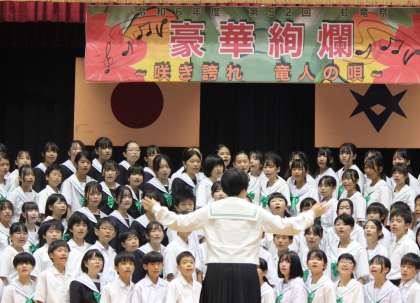 【虹竜祭】竜人の唄(1年合唱コン) 公開日 2024/11/05 更新日 2024/11/05 学校行事 豪華絢爛 ---咲き誇れ 竜人の唄--- いよいよ午前のメイン、合唱コンクールです。1年生の学年合唱「COSMOS」からスタートです。一人一人が銀河の星となってハーモニーを奏でました。