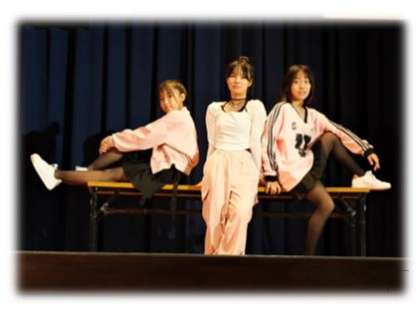 有志発表の姿です。開校以来「自由闊達な校風」を大切にしてきた竜神中です。生徒が特技や努力してきたことを披露し、それを全員で称え合う場として設定しています。