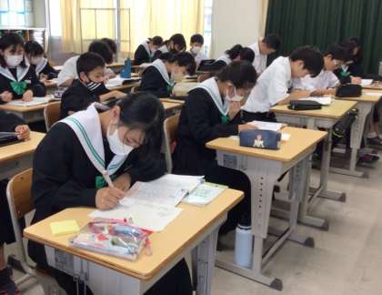 教育相談の時間に、教育相談以外の生徒は明後日のテストに向けた自習をしていました。どこまでテスト勉強が進んでいるのか、クラスを回ってみました。