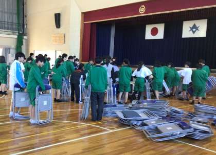 11/21 誇らしげに片付ける生徒たち(2年) 公開日 2024/11/22 更新日 2024/11/22 生徒の活動 2年自然教室・進路説明会の会場片付けを2年1組と2組の生徒が行いました。嬉々として誇らしげに片付ける姿が見られて、清々しい一日になりました。 ゆっくり片付けたら下校に間に合わないかも・・・という心配は杞憂に終わりました。