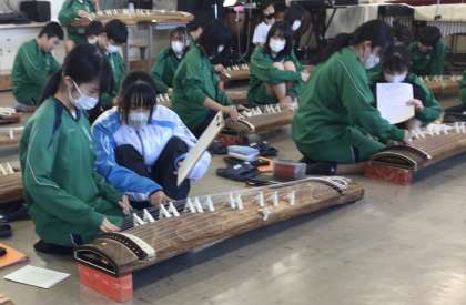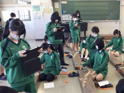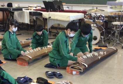 琴の学習にとっては、探究のプロセス(2)情報収集は、知識と演奏技能の習得にあたります。生徒たちは、何度も練習して技法を習得していきます。ペアでの教え合いがみられる素敵な時間です。このクラスも温かい教え合いをたくさん見ることができました。