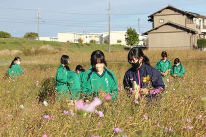 竹上地域環境保全隊の皆様が、毎年コスモス畑をつくってくださり、地域の方々の目と心を和まてくださっています。「少しでも協力できることがあれば・・・」と、竜中生がそのコスモスの種子を集めています。
