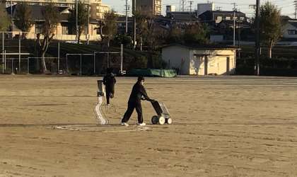 部活動やナイターで授業のラインが消えてしまうために、体育の先生は毎朝、運動場にラインを引いているのですが、今日は交通安全指導のためひくことができません。