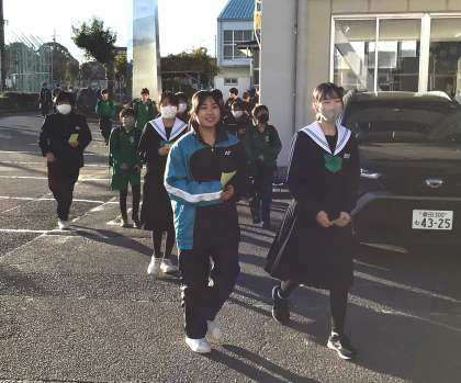 にっこり愛さつウィークの仕事を終えて戻ってくる議員の子たちです。充実した時間だったのでしょう。すてきな笑顔ですね。生徒の成長がほほえましいです。