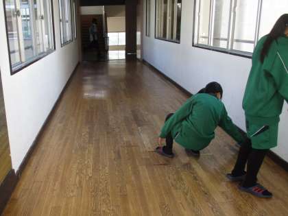 1年生が渡り廊下のそうじをしていました。いつもは二人で廊下の真ん中を境に雑きんがけをしているのですが、今日は一人欠席のため、一人で端から端まで行っていました。しかもていねいに!