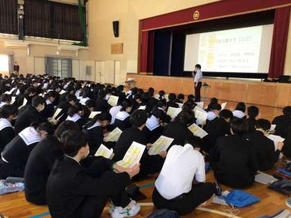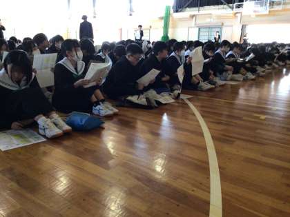 本日、2年生は学年集会で進路希望調査の書き方を学びました。
