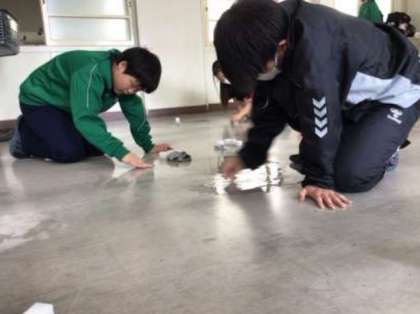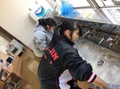 「次に使う後輩たちに少しでも気持ちよく教室を使ってもらいたいから、もっと磨き上げたい。」と額に汗をにじませる1年生たち。