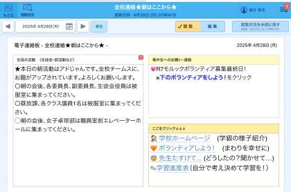自律の練習として、竜神中の朝の会はタブレットからの情報を生徒自身が確認することから始まります。市の年度移行が終了し、先週の途中からSKYMENUが使えるようになりました。SKYMENUの全校連絡板と学年連絡板で1日の確認をします。(1年生はまだ学年連絡板を開設していません。担任が必要な連絡をして、聞く力を育んでいます)