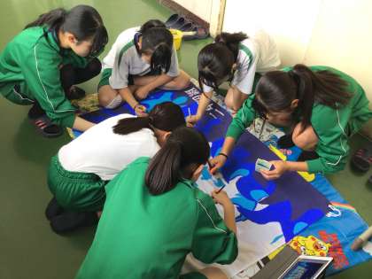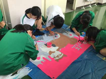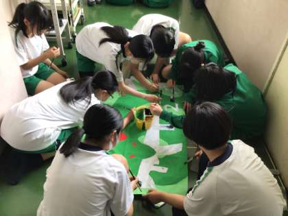 短い時間で3学年が協力し、団旗を制作しています。統一感のあるデザインになるよう、3年生スタッフが事前に3学年分の下書きを仕上げました。今は完成に向けて最後の色塗りの段階です。3年生が1日の目標を示し、引っ張る姿はとても頼りになります。闘竜祭練習で築いたこの団結力の成果をぜひお楽しみください。