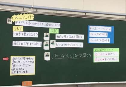 今日は、「聞き上手、話し上手になろう」という自立活動の研究授業を行いました。膝をつけて子どもたちの目線に合わせて話を聞いたり、話す生徒の目線がみんなの方に向くように立ち位置を変えるなど、ていねいな指導が印象的でした。生徒も最初は緊張していましたが、途中からいつもの姿が見られるようになりました。