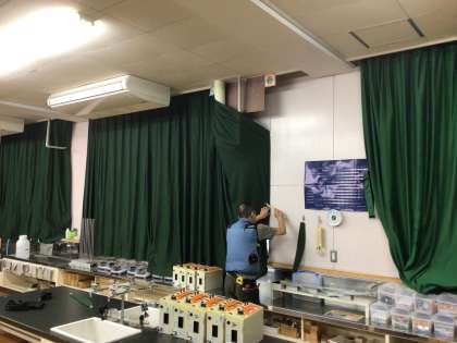 6/26 とうとう暗幕が!(理科室) 公開日 2025/06/26 更新日 2025/06/26 お知らせ 理科室の暗幕がボロボロで真っ暗にする実験ができませんでした。暗幕カーテンの修繕は優先順位があってなかなか申請しても通りません。今回、学校の予算をやりくりして、カーテンを修繕しました。全部交換とはいきませんでしたが、十分に実験ができます!
