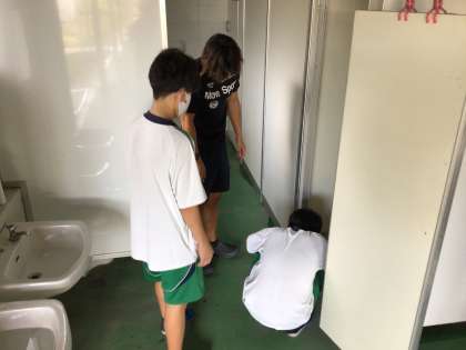 清掃の時間、2年生が竜文館のトイレのねじを必死に閉めていました。チャイムが鳴り終わっても、全部終わるまで作業していました。