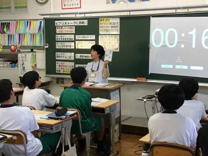 今年度から1年生は表現力を高める目的で、好きな本を3分間で紹介するビブリオトークを国語の授業で行います。今日は、豊田市図書館から講師を招きました。