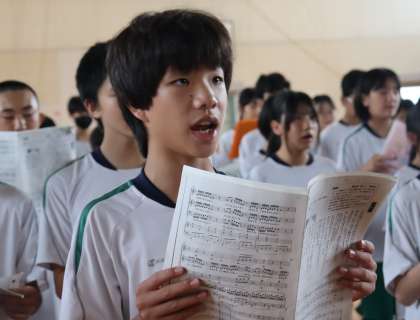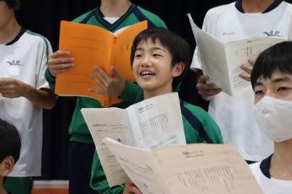 1年生の合唱練習を見ると、素敵な表情の生徒がたくさんいます。合唱には、歌声だけでなく、大きな口で表情よく歌う姿からも聴く人を感動させる力があります。練習は始まったばかり。さらに多くの生徒が「目から伝わる合唱」の魅力を届けてくれることを期待しています。