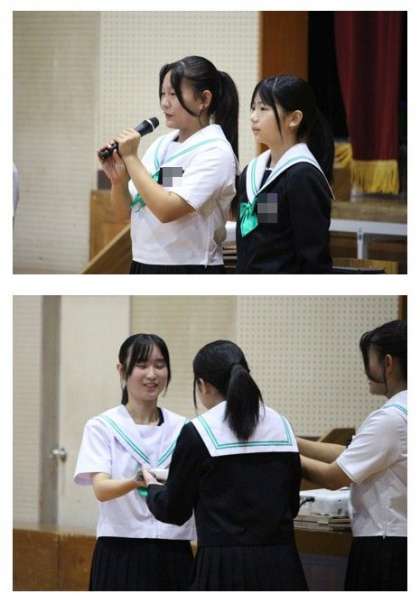 10/14【貢献】家庭科部が配膳台カバーをプレゼント 公開日 2025/10/14 更新日 2025/10/14 生徒の活動 後期開始の全校集会を前に、家庭科部が配膳台カバーをプレゼントしてくれました。 家庭科部の生徒たちが、配膳台のカバーがぼろぼろだったことに気づき、自分たちの技術で新しく作ろうと思ってくれたそうです。心のこもった部長のメッセージでした。 生徒会長が受け取ったのも素敵でした。生徒から生徒へ、学校はこうやって自治的に運営されていくんだなあと思いました。