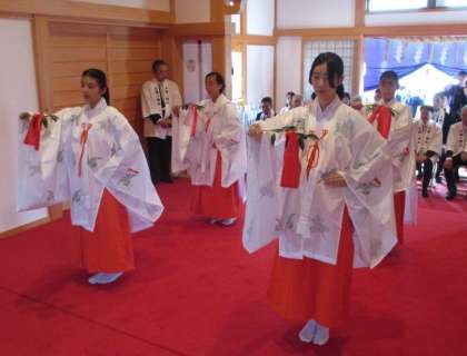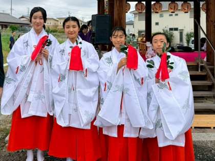 竜神の誇り☆土橋八幡社 巫女舞ボランティア 公開日 2025/10/22 更新日 2025/10/22 お知らせ 10月12日(日)、本校生徒4名が土橋八幡社にて巫女舞奉納・巫女舞披露を行い、地域文化の継承に貢献しました。お祭りに参加した小学生に巫女へのあこがれをもたせ、夢を与えてくれたようです。学校で募集したボランティア活動ではありませんが、地域のために力を尽くす姿は竜神中学校の誇りです。