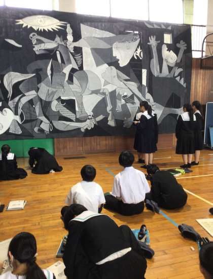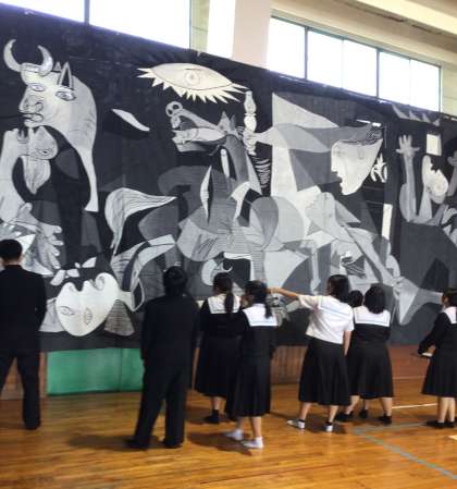 ゲルニカの原寸大の模写を使って、竜文館で授業を行いました。美術の教科書にもゲルニカはあるのですが、小さくて迫力が伝わりません。