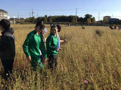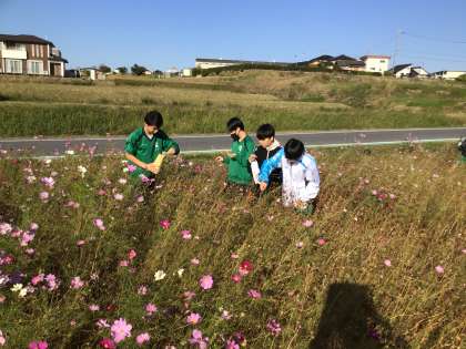 竹上地域環境保全隊の皆様が、毎年コスモス畑をつくってくださり、地域の方々の目と心を和まてくださっています。竜中生がそのコスモスの種を集めていて、翌年の花になります。