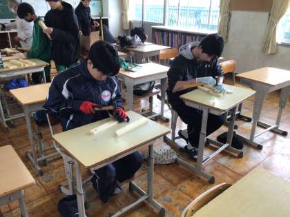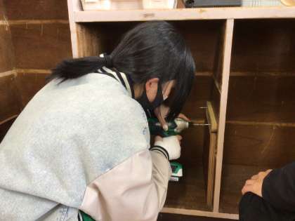 本日は、3年生教室のロッカー改修と2年生教室の棚板の固定を行いました。活動を進める中で、3年生のロッカーの構造が1・2年生の教室と異なることが分かり、頭を悩ませる場面がありました。50名を超えるボランティアの方々に十分な活動を保証できず、ご迷惑をおかけしました。その後、ロッカーの棚板をジャッキを使わない方法で取り外し、新たな板を棚板として作ることで対処しました。2年生の棚板の固定を担当していた一部の生徒の協力もあり、時間をかけて3クラスのロッカーを完成させることができました。