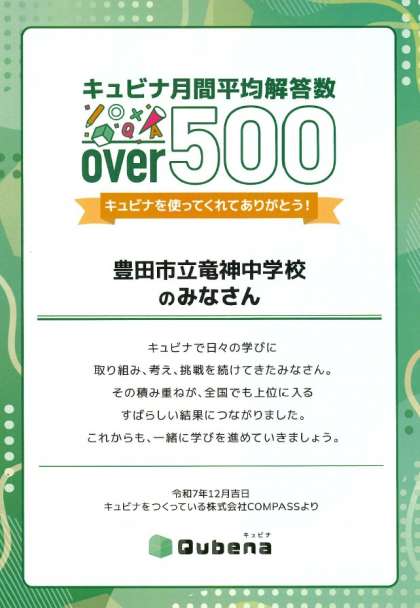どうやら「月間平均解答数」が500問を超え、全国上位3%に竜神中が入っているそうです。